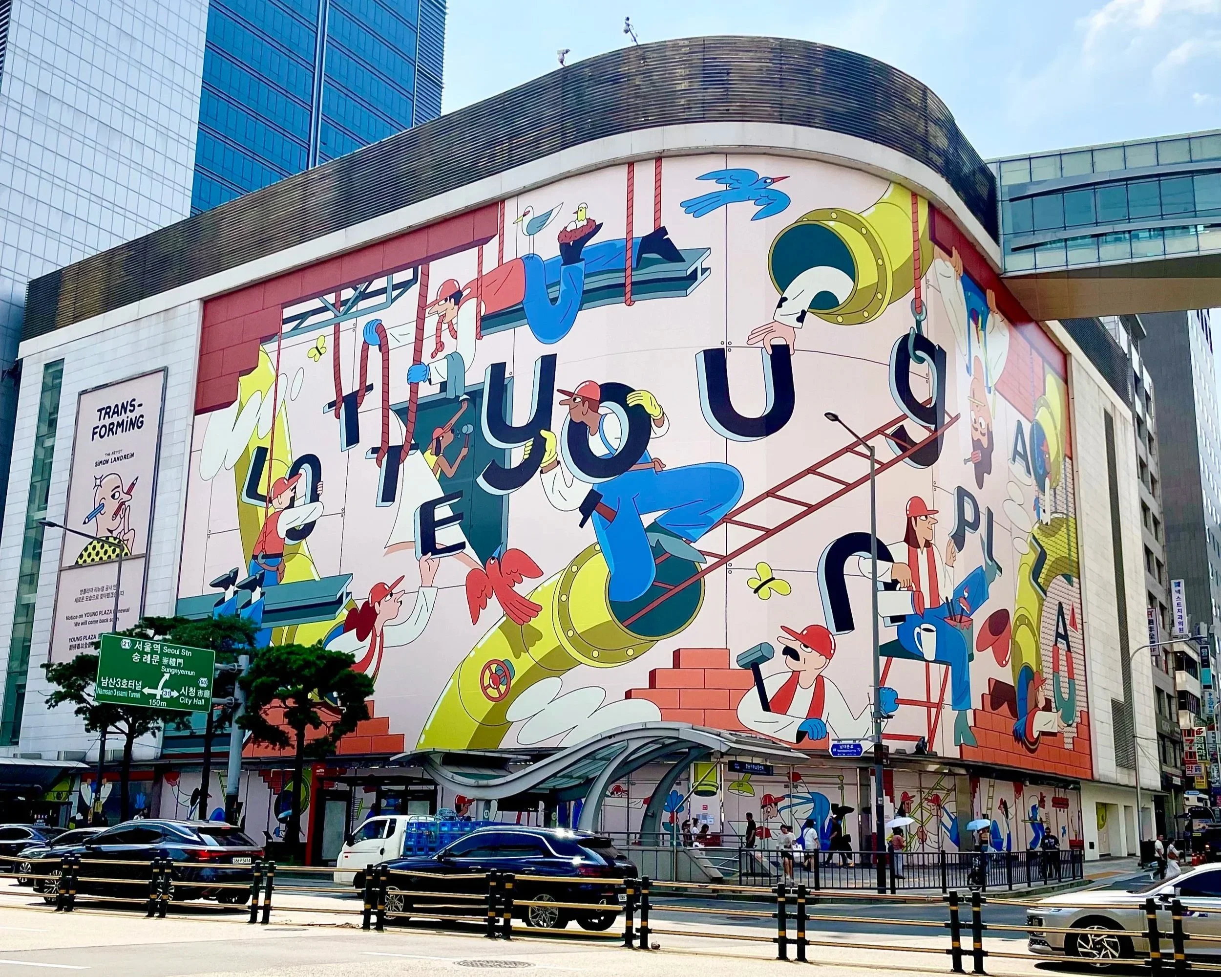 As part of the renewal of Young Plaza, Lotte sought an illustrator to create artwork for the exterior of its large shopping mall in Myeongdong, Seoul. Believing Simon Landrein to be the perfect fit, they initiated the collaboration through Pocko.